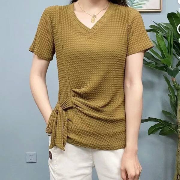 女生v領玉米格褶皺短袖